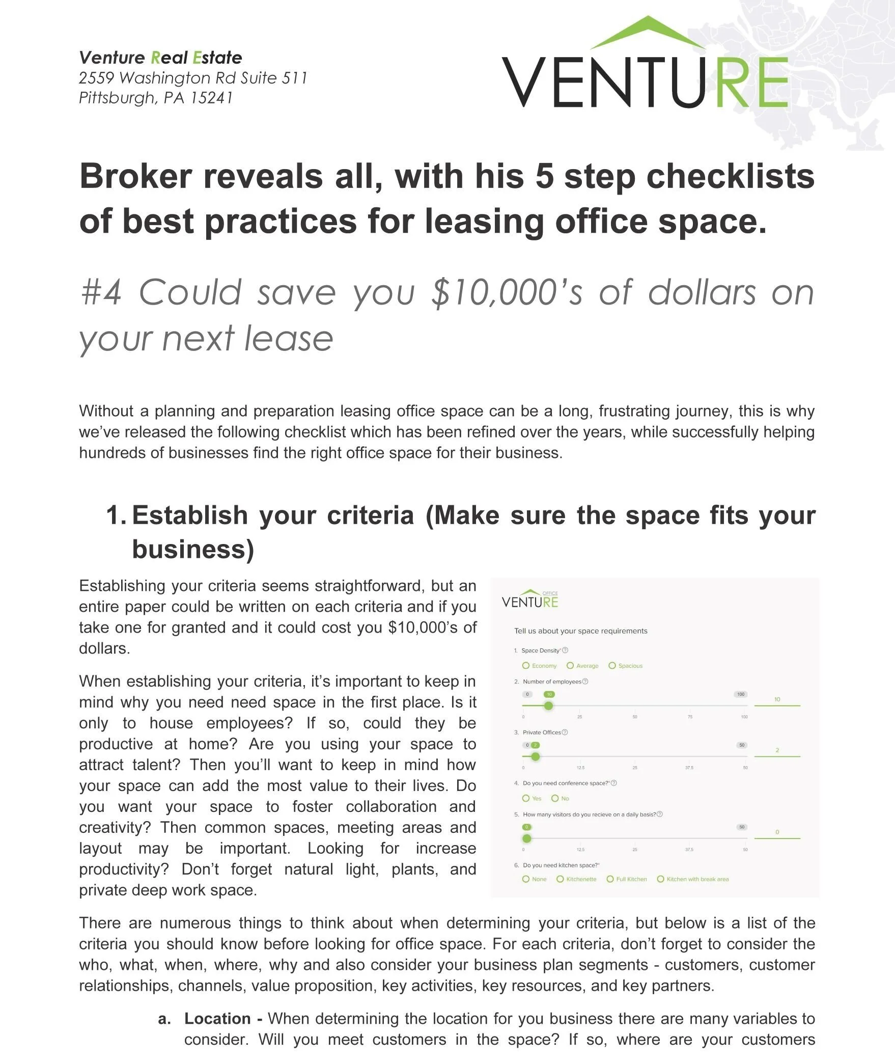 5 step checklist will guide your through the journey to your new office, including information on how to establish your criteria, links to websites with available property listings, a guide for rating and comparing space features, a framework for receiving multiple apples to apples lease proposals, and tips for negotiating the best possible rate.